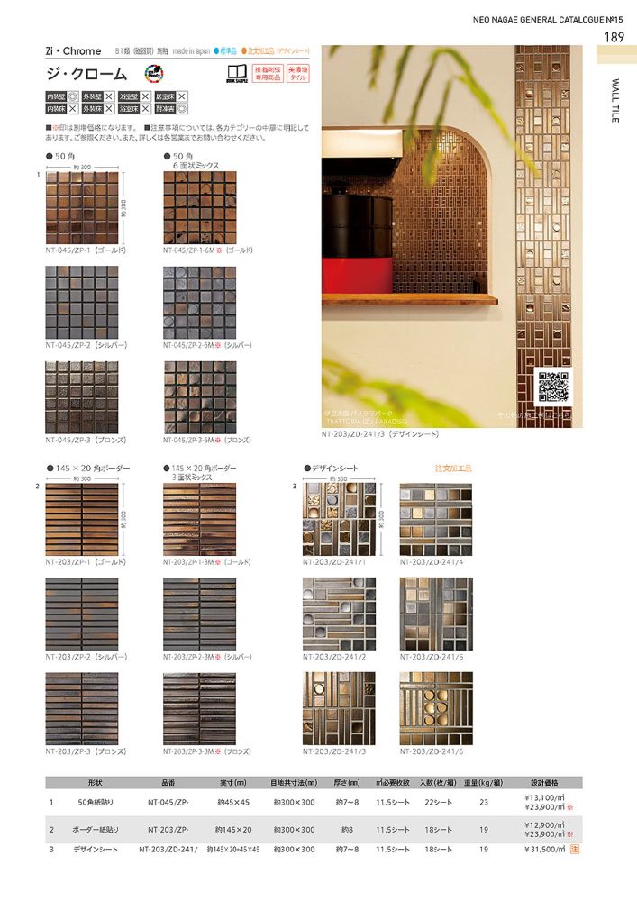 ジ・クローム 内装タイル 2025.10.23施工例, インテリア&エニィウォール, 日々の風景 Share +1 Hatena RSS 品番:NT-203/ZP-2-3M(シルバー) 品番:NT-203/ZP-3-3M(ブロンズ) NT-203/ZP-3-3M(ブロンズ) 高級感・重厚感ある壁面を演出してくれる「ジ・クローム」 50角とボーダー、そして面状のミックスと多種類からお選びいただけます! Share +1 RSS 投稿者: 東京 営業所東京の主要な建造物には多数のタイルが使われています。タイルには装飾としての意匠の魅力以外に、時代を越えた「温もり」のようなものがあり、それが人々を魅了して各地の名所と呼ばれる建築に使われているのでではないでしょうか。各観光地の名所にお出掛けの際は是非、建造物のタイルを見つけてみてください。そのタイルもきっと、長く愛される名所の一部として時代を刻んでいます。施工例, インテリア&エニィウォール, 日々の風景 ジ・クローム 内装タイルの施工例