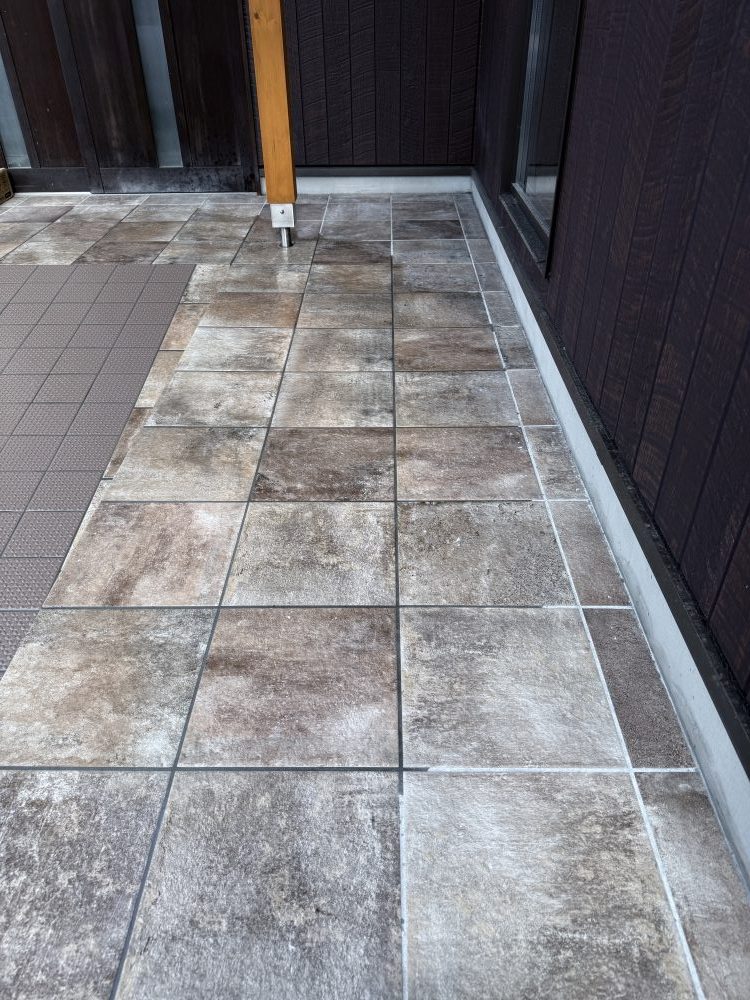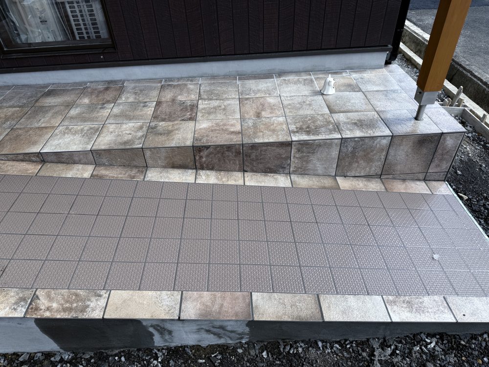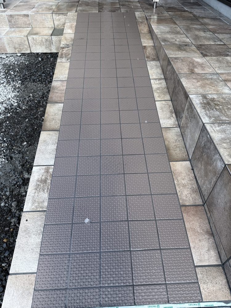 ミリアリアNF-300/MIL-3 カフェの入り口に・・・施主様と直接の打合せで、大きな色むらと色幅を大変気にいっていただき全面施工の予定でしたが、スロープ部分は専用タイルにしていただきました。商品はティグリスNF-157B/TI-6を!!