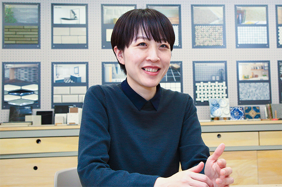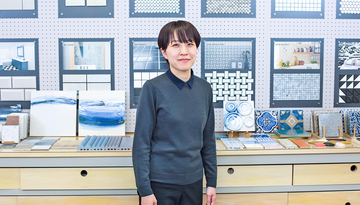 ふと見たお店に使ってあるタイルを調べたところ、いきついたのが長江陶業。このことがきっかけで入社しました。デザイン事務所や設計事務所等、プロの方たちへタイルの魅力を伝えるには知識だけではなく、自分自身のタイルに対しての情熱が不可欠だと思います。お客様と打合せを重ねる度に、困っていることや不安なことへの相談や、時には難しい要望をいただくこともあります。前向きな提案と冷静な判断ができたとき、営業としての喜びと面白さを感じます。時折、提案した現場に出向くことがありますが、実際の完成品を目にしたときには達成感が湧いてきます。この仕事の魅力は、タイルに携わるすべての方々との交流から、たくさんの刺激を受けて成長していくことができること。これからも笑顔と謙虚な気持ちを大切に、タイル伝道師として学び続けていきます。